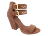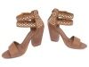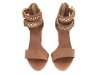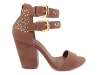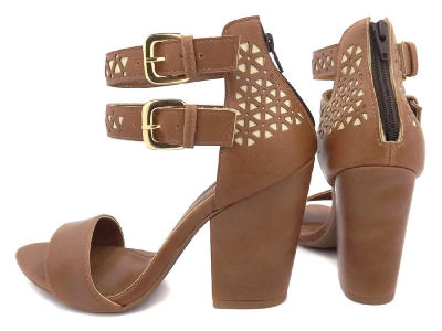Sapato peep toe feminino, material em sintético nas cores caramelo e off white, palmilha encapada na cor caramelo, detalhes em recortes a laser e fivelas na cor dourado, salto encapado na cor caramelo com 9 cm de altura, zíper na cor café, sola emborrachada na cor natural.