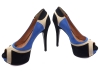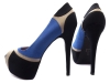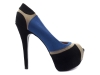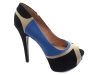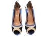 Sapato peep toe feminino com meia pata, material em sintético nas cores azul, preto e off white, meia pata interna encapada na cor azul, palmilha encapada na cor preto, salto encapado na cor preto com 13,5 cm de altura, sola coletada cor preto.